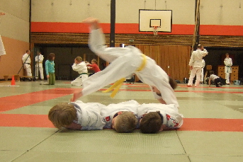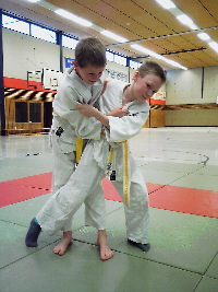 Wir üben natürlich nicht nur das richtige Fallen, sondern auch Wurftechniken im Stehen und Haltetechniken im Boden, um uns richtig verteidigen zu können. Das alles machen wir natürlich ohne unserem Partner wehzutun!
